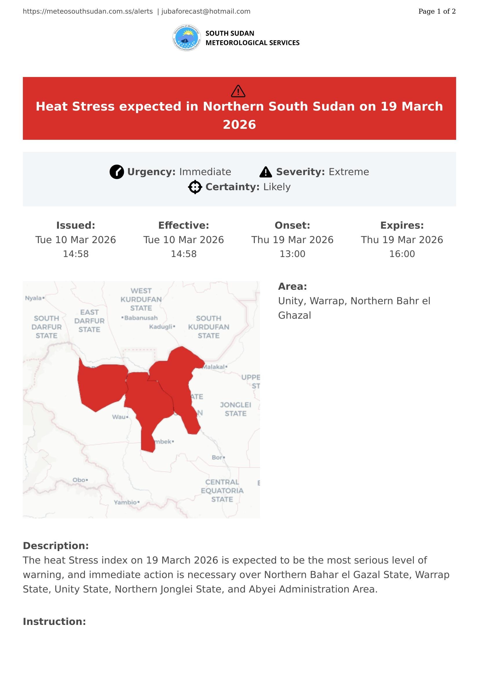 The heat Stress index on 19 March 2026 is expected to be the most serious level of warning, and immediate action is necessary over Northern Bahar el Gazal State, Warrap State, Unity State, Northern Jonglei State, and Abyei Administration Area.