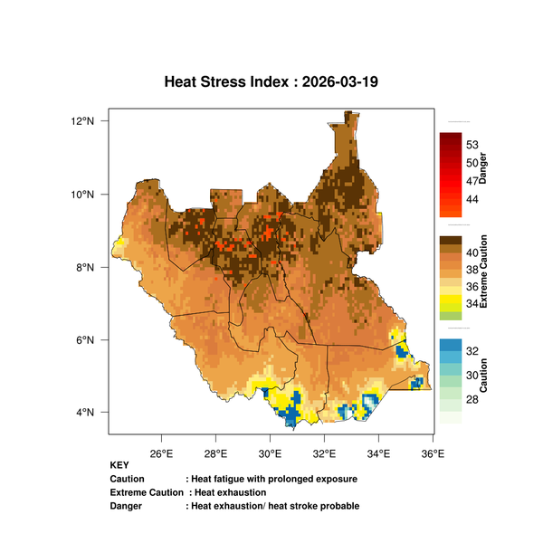 Important Note: The heat Stress index on 19 March 2026 is expected to be the most serious level of warning, and immediate action is necessary over Northern Bahar el Gazal State, Warrap State, Unity State, Northern Jonglei State, and Abyei Administration Area.
